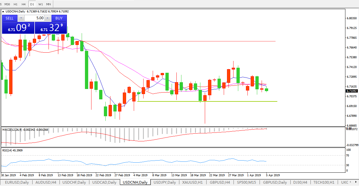 技术面简析:日线图均线死叉看跌,MACD在0轴附近徘徊且动能柱量能萎缩,RSI缓步走低,汇价企稳多空转折区域并连续多日震荡整理,短期走势或取决于中美经贸磋商最新进展。