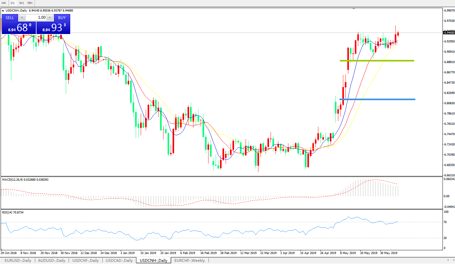 技术面简析:日线均线整体维持攻势MACD0轴上方运行但动能柱轻微缩量RSI超买区域附近运行,汇价强力上攻后宽幅强势整理,预计短期汇价有整理需求,中期重点关注中美贸易争端后续进展