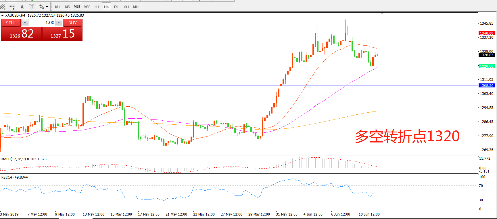 4小时图看,金价两次触碰1340阻力后回落,确认上方阻力有效,均短期均线走平,MACD红柱减少,RSI指标向上,短期以高位震荡思路对待。