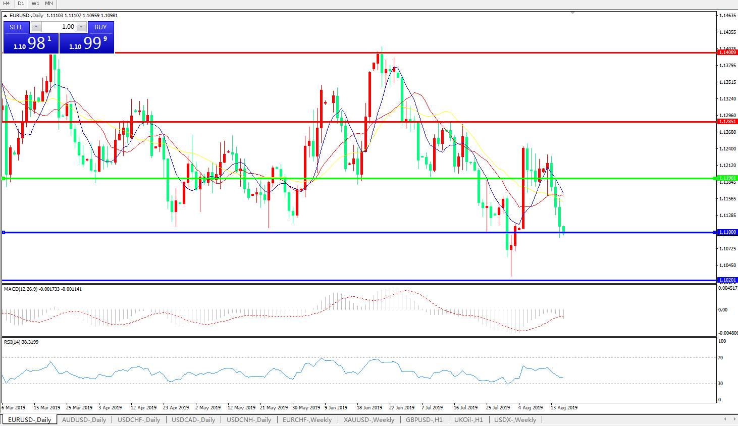 技术面简析:日图均线整体呈下行态势,汇价连续下跌触及重要支撑,MACD有再度下行迹象且动能柱延续放量态势,RSI缓步走低,预计短期汇价存进一步下行需求,中期汇价需关注前低1.10附近支撑是否持续有效。