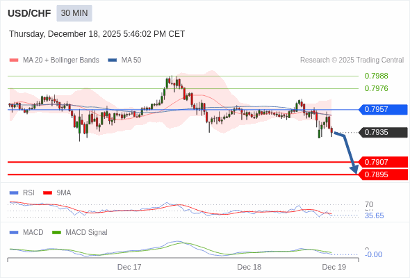 美元/瑞郎 当日内 : 看跌,在 0.7957 之下。