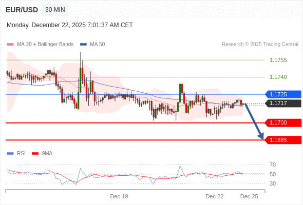 在 1.1725 之下,看跌,目标价位为 1.1700 ,然后为 1.1685 。