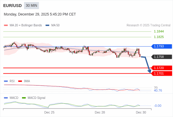 欧元/美元 当日内 : 看跌,在 1.1793 之下。