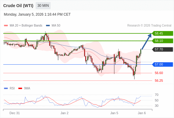 在 57.00 之上,看涨,目标价位为 58.10 ,然后为 58.45 。