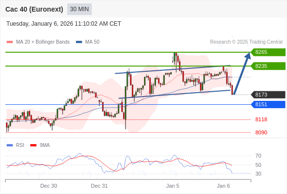 法国CAC指数期货 (Euronext) (F6) 当日内: 超短线(当日内)支撑位在8151附近。