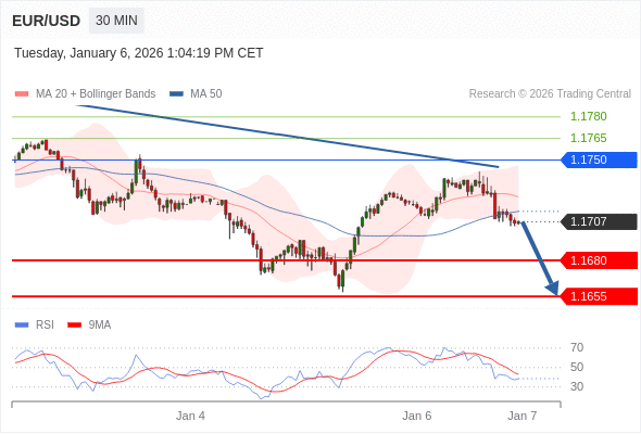 在 1.1750 之下,看跌,目标价位为 1.1680 ,然后为 1.1655 。