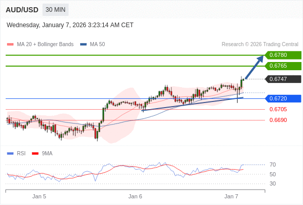 交易策略: 在 0.6720 之上,看涨,目标价位为 0.6765 ,然后为 0.6780 。