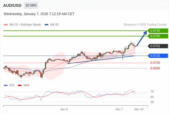 在 0.6725 之上,看涨,目标价位为 0.6780 ,然后为 0.6795 。