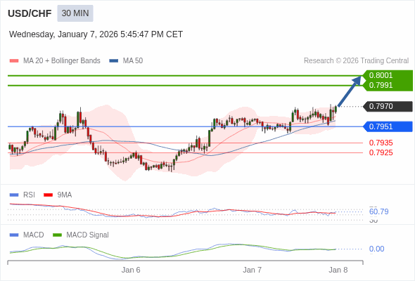 美元/瑞郎 当日内 : 看涨,当 0.7951 为支撑位。