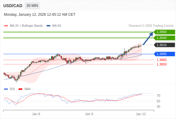 在 1.3885 之上,看涨,目标价位为 1.3940 ,然后为 1.3960 。