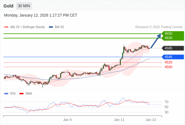 交易策略: 在 4545 之上,看涨,目标价位为 4630 ,然后为 4650 。