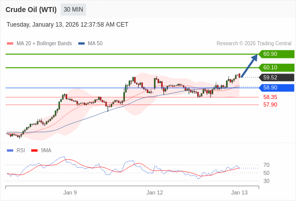 在 58.90 之上,看涨,目标价位为 60.10 ,然后为 60.90 。