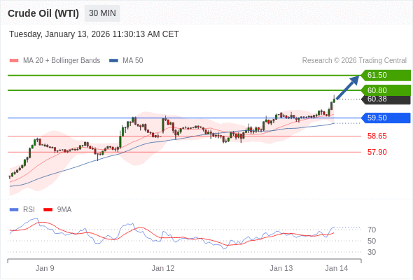 在 59.50 之上,看涨,目标价位为 60.80 ,然后为 61.50 。