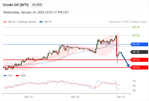 在 61.20 之下,看跌,目标价位为 59.50 ,然后为 58.65 。