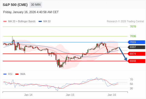 美国标普500指数期货 (H6) 当日内: 短期关键阻力位在7015。