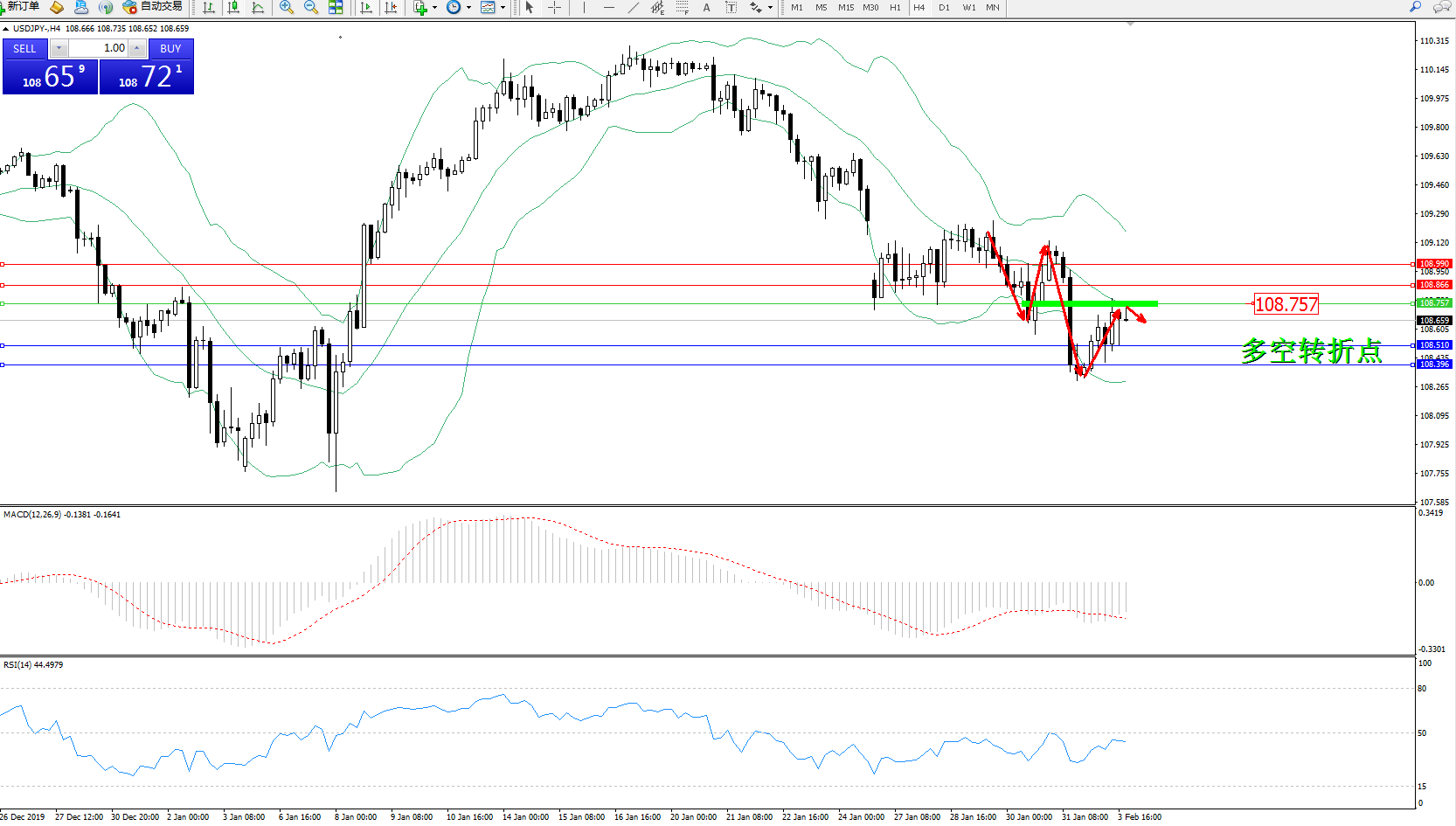 交易策略:108.757下方看跌,目标108.510108.396