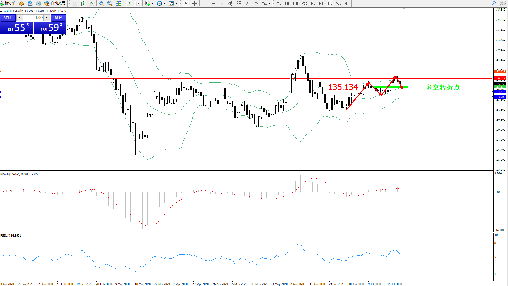 交易策略:135.134上方看涨,目标136.312、137.238