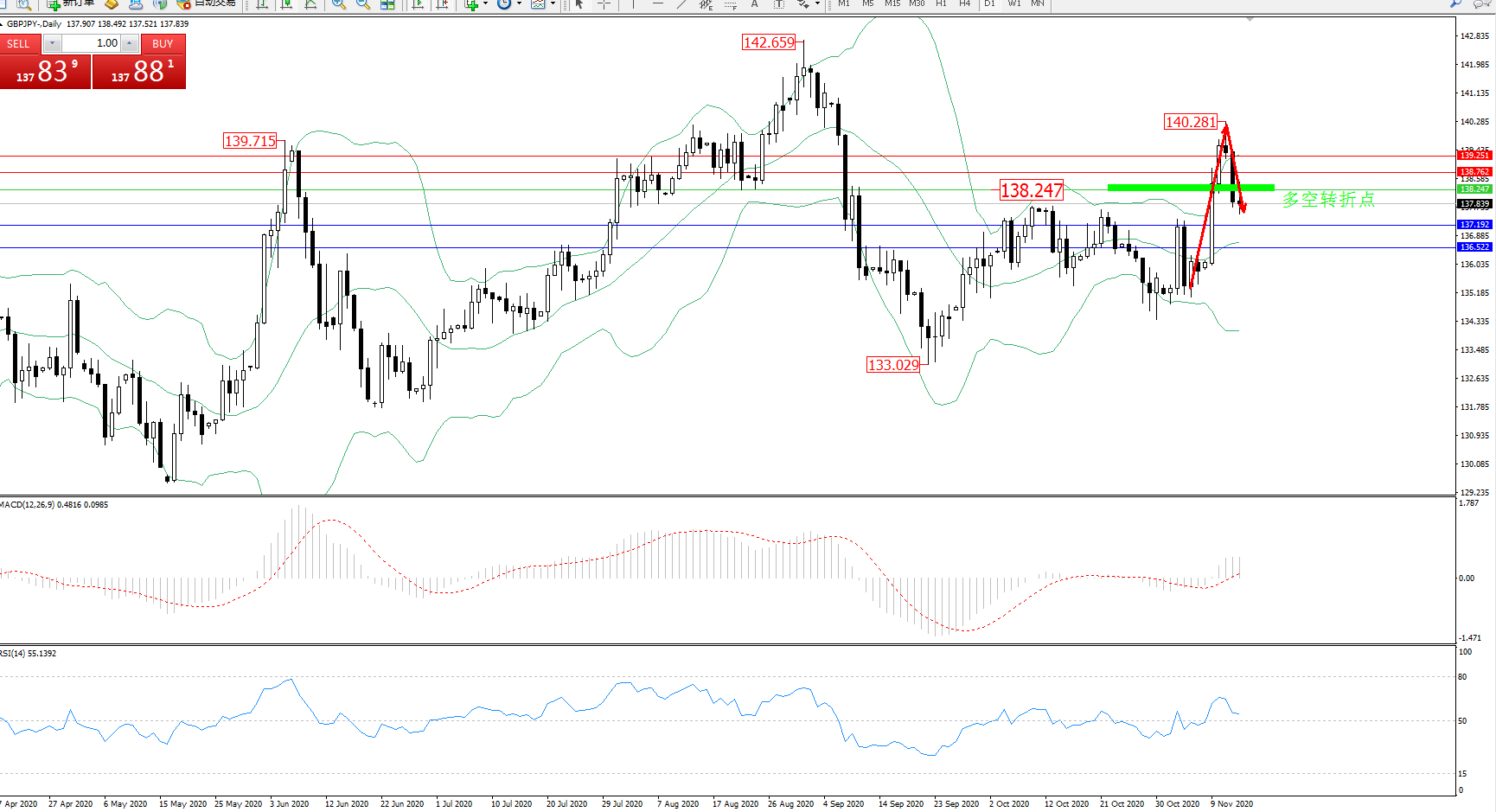 技术点评:多头动力延续布林带指标上轨附近强势拉升上扬态势良好,高位抵达140.281附近后遇阻开始快速回撤下移,多头拉升动力结束,空头下行动力入场,布林带指标呈张口走势后有收口迹象,MACD指标低位多头多空持续震荡上扬至0轴线上方多头区域维持震荡,RSI指标处于50均衡线上方多头区域震荡后开始缓慢下行中;
