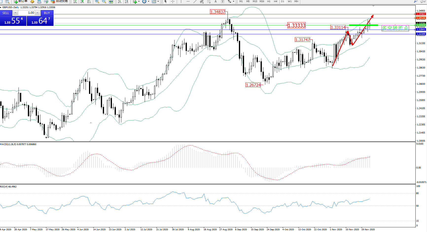 交易策略:1.33333上方看涨,目标1.34126、1.34563