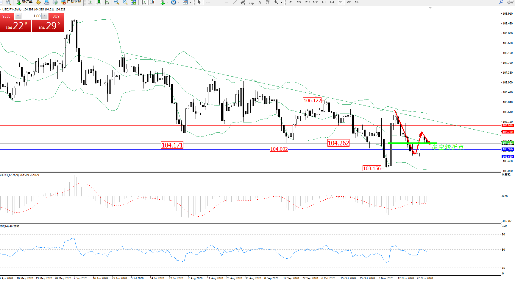 美元兑日圆弱势回撤至104.228附近徘徊,在美国假日到来之际,更多资金依旧选择从美国市场撤出寻求避险,在此背景下,美元兑日元日内仍有进一步下行空间,并且汇价波动幅度可能因为假日交投清淡而被额外放大,,日本10月全国核心消费者物价指数(CPI)同比下降速度近10年来最快。去年消费税上调带来的刺激力度消退,加剧了人们对日本经济在苦苦应对疫情之际将重返通缩的担忧;市场对当前疫情的发展与德国总理默克尔的发言表现出更大的担忧,美元和日元的避险功能双双得到强化。市场对当前疫情的发展与德国总理默克尔的发言表现出更大的担忧。