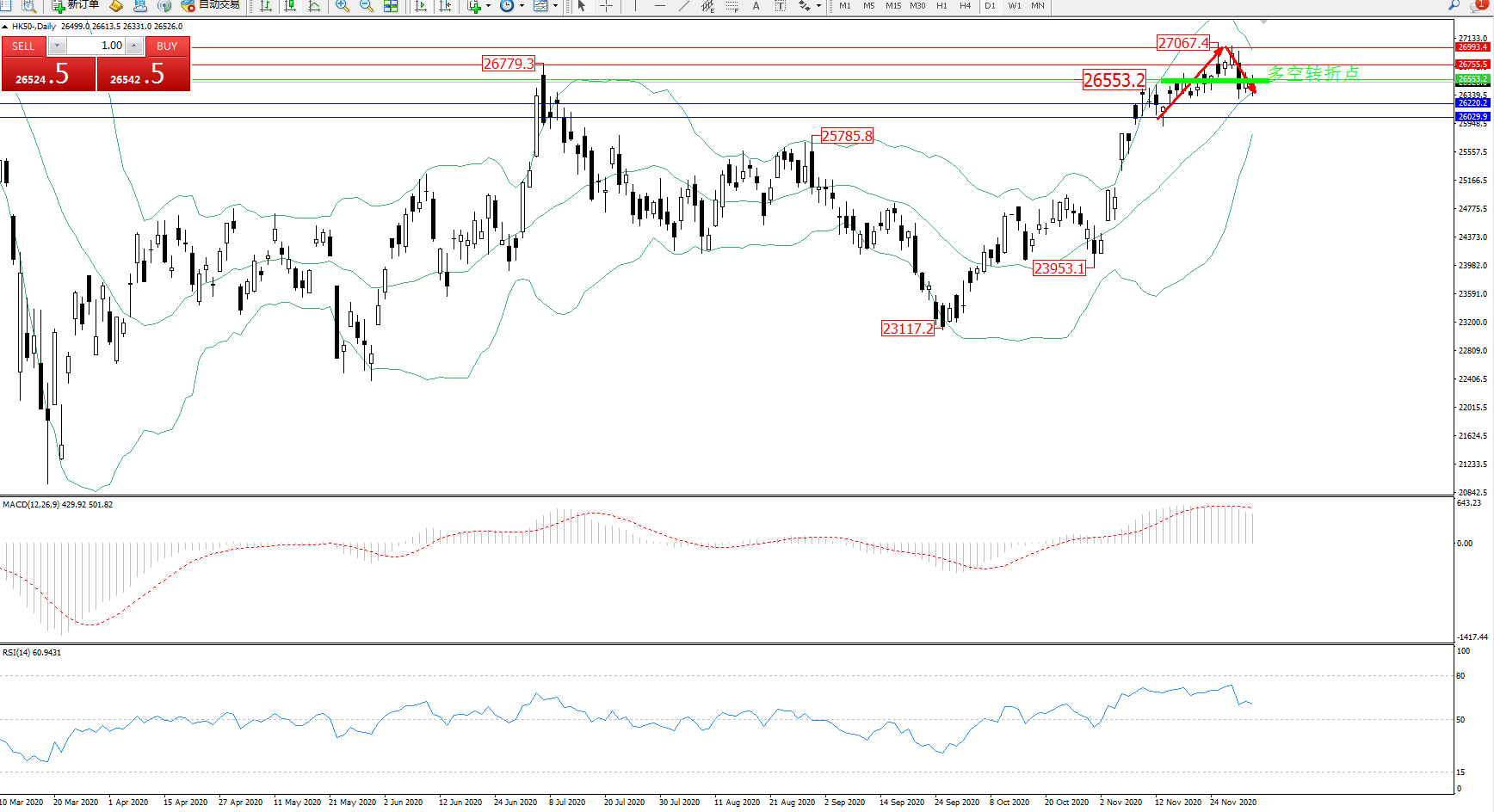 技术点评:多头动力延续布林带指标中上轨区间持续震荡上扬后,高位抵达27067位置遇阻开始震荡下行,触及布林带指标中轨附近节点后开始窄幅整理,高位空头动力短暂回撤后开始弱势平移,布林带指标呈收口走势中,MACD指标处于多头区域高位持续整理平移后有下行迹象,RSI指标处于多头区域高位持续整理下移后徘徊;
