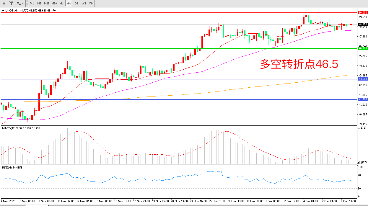 4小时图看,油价延续高位震荡,短期涨势有所回调55周期均线成为短期支撑50美元成为中期阻力MACD红柱减少,RSI指标走平,日内延续震荡概率较大。