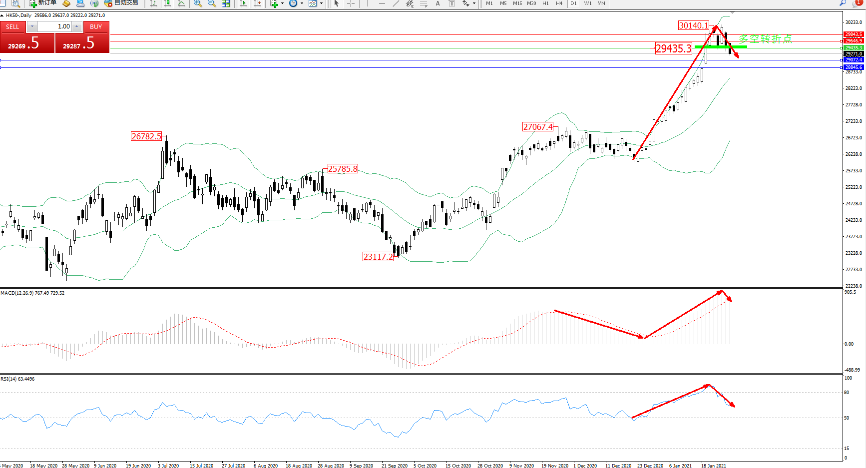 技术点评:多头动力延续布林带指标上轨附近持续震荡上扬至30140附近节点后遇阻,开始震荡回撤下行,短期或将继续调整,布林带指标呈持续拉升上扬后开始收口,MACD指标处于多头区域高位持续拉升后出现缓慢转势有下移迹象,RSI指标处于超买区80均衡线附近遇阻后震荡回撤下行;
