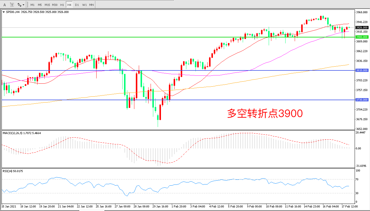 4小时图看,标普500长阳拉升后延续高位震荡,整体表现依然强势,3900成为下方支撑,均线系统呈多头排列,MACD红柱缩短,RSI指标走平,日内延续震荡概率较大。