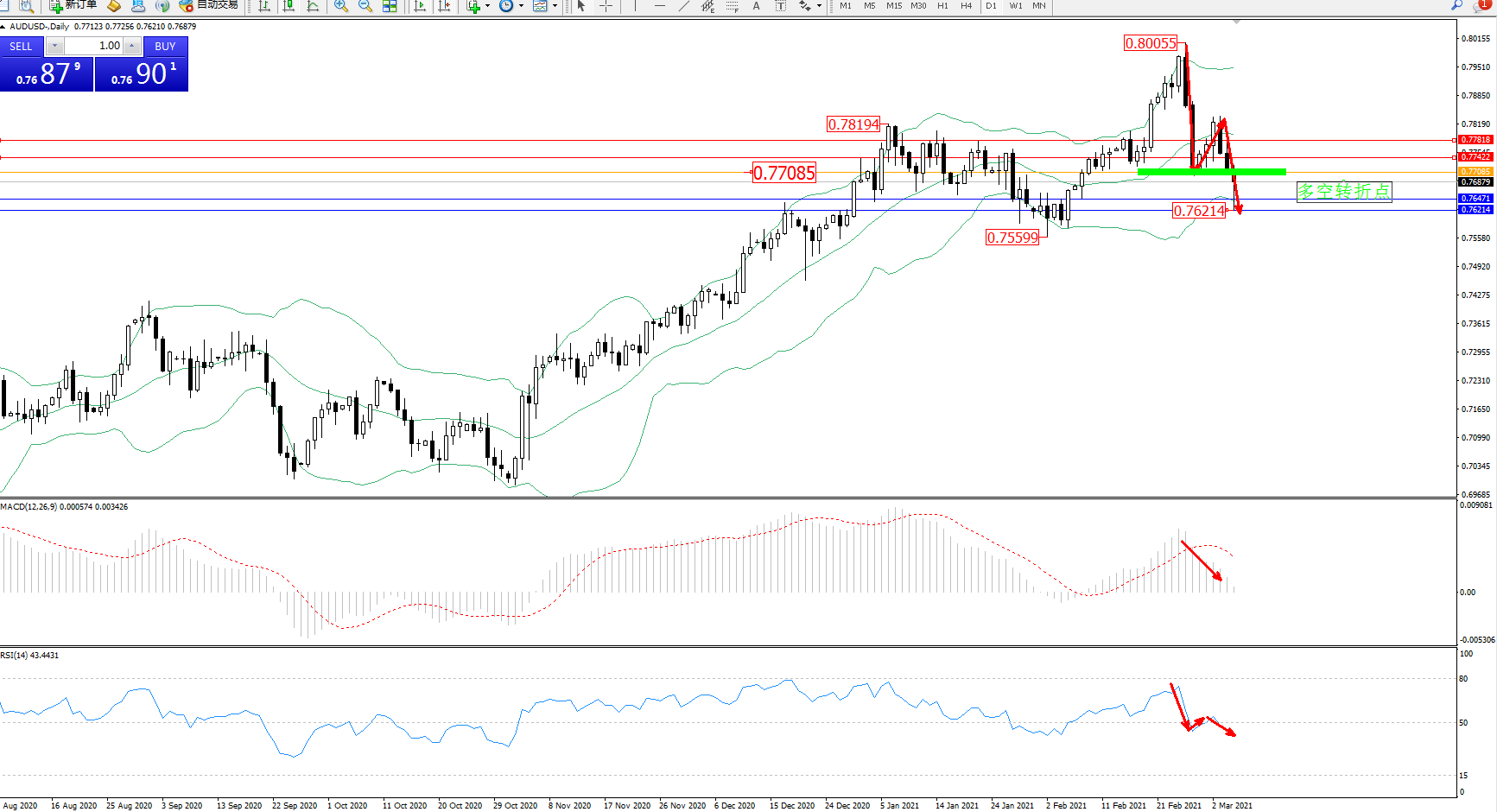 交易策略:0.77085下方看跌,目标0.76471、0.76214