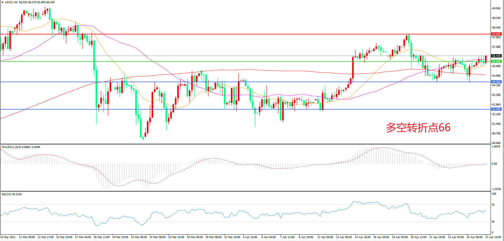 4小时图看,油价长阳拉升,强势突破前期整理区间,短期表现十分强势,21周期均线成为下方支撑,68美元成为上方阻力,MACD红柱增加,RSI指标向上,日内震荡上行概率较大。