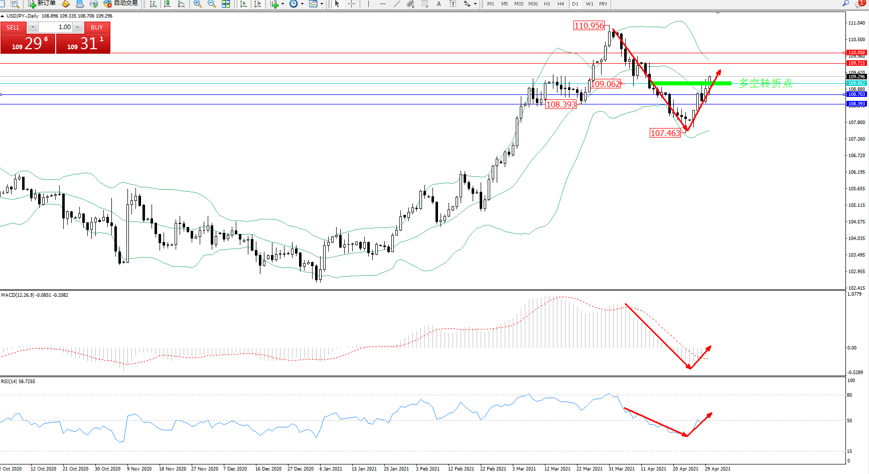 技术点评:高位空头动力延续空头下行走势持续下挫,触及布林带指标下轨附近节点后不断向下移动,空头动力下行至107.463附近得到支撑短暂整理后急速回升,突破中轨进入中上轨区间持续拉升中,布林带指标呈张口走势后开始缓慢收口中,MACD指标处于0轴线下方空头区域持续震荡后开始有回升迹象,RSI指标处于空头区域整理后急速反转上行,突破50均衡线节点整理上扬;