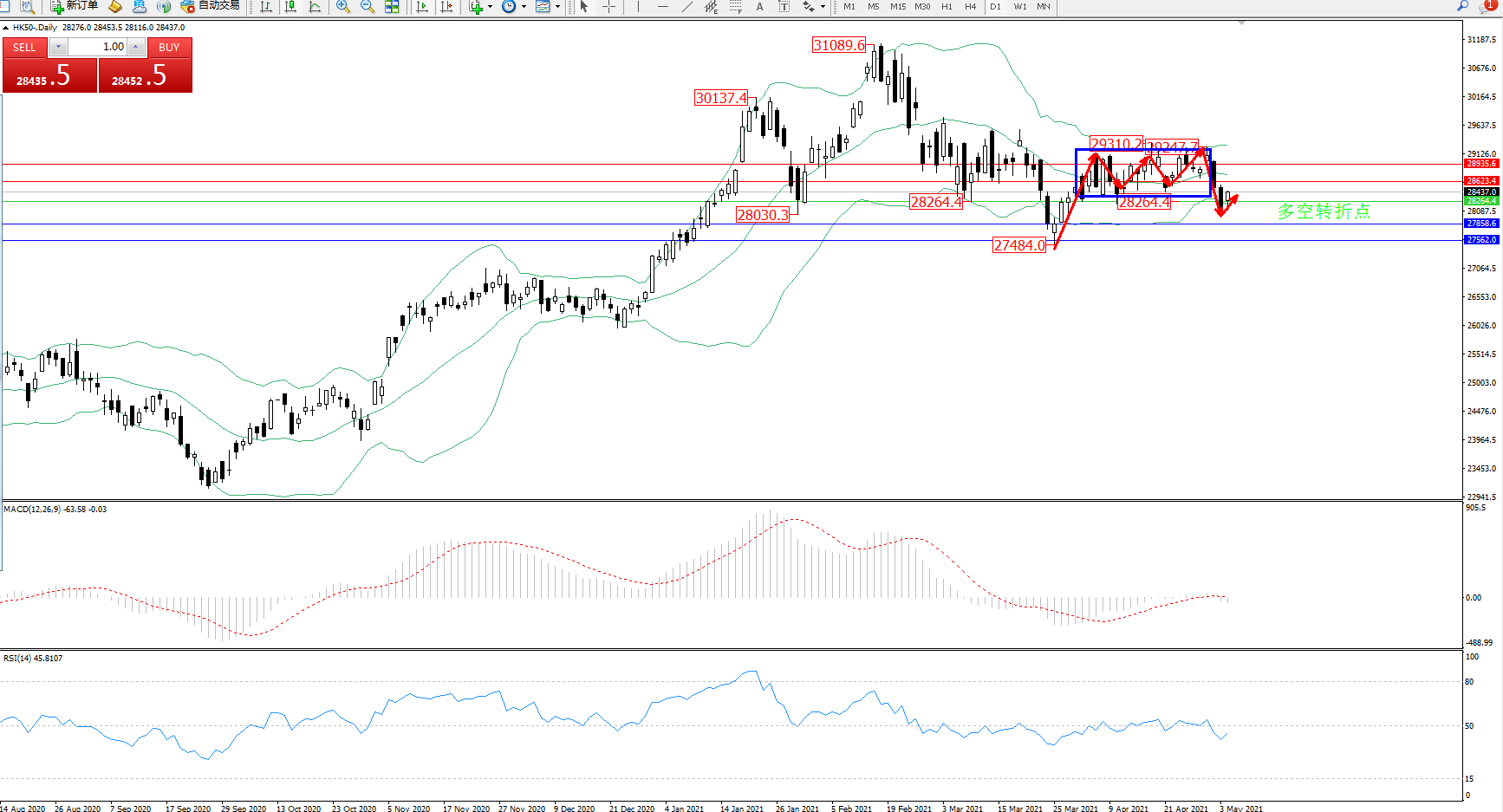 恒指HK50 ——日K线图显示: