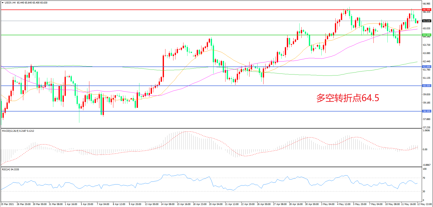 4小时图看,油价冲击66.5美元附近再次回落,区间震荡迹象较为明显,66.5美元成为上方阻力,55周期均线成为下方支撑,MACD红柱增加,RSI指标走平,日内震荡延续概率较大。