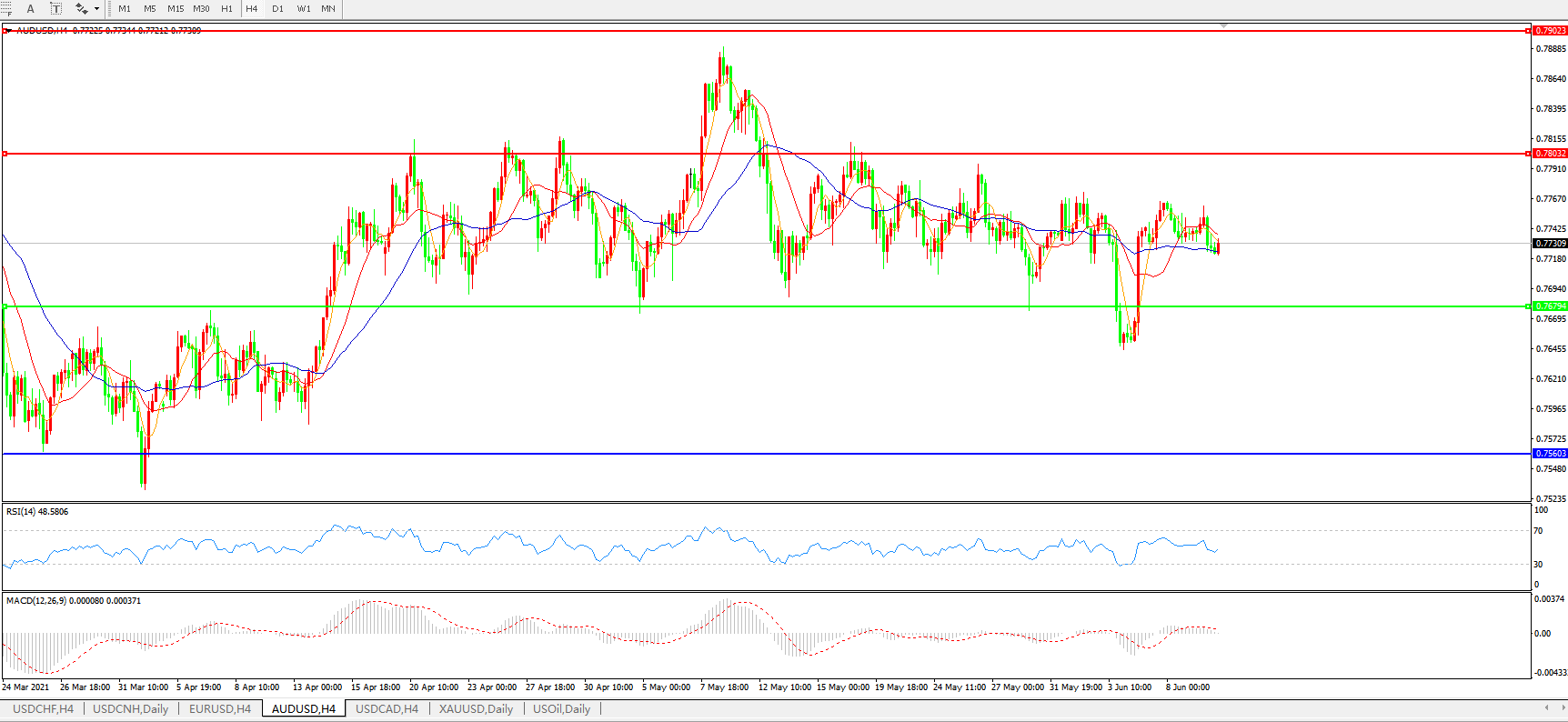 备选策略:0.7680下方看跌,目标0.7560、0.7400