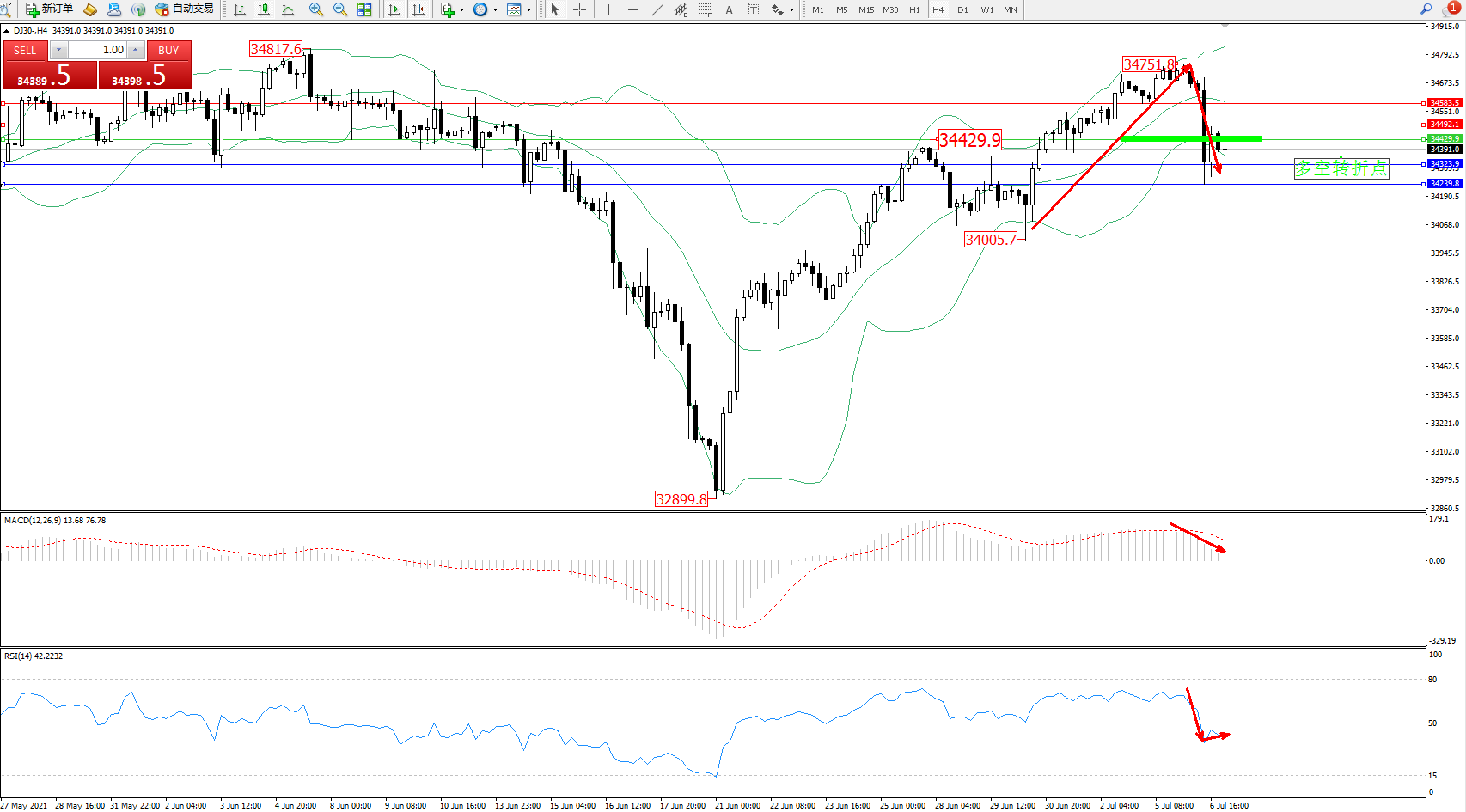 道琼斯指数DJ30——4小时K线图显示: