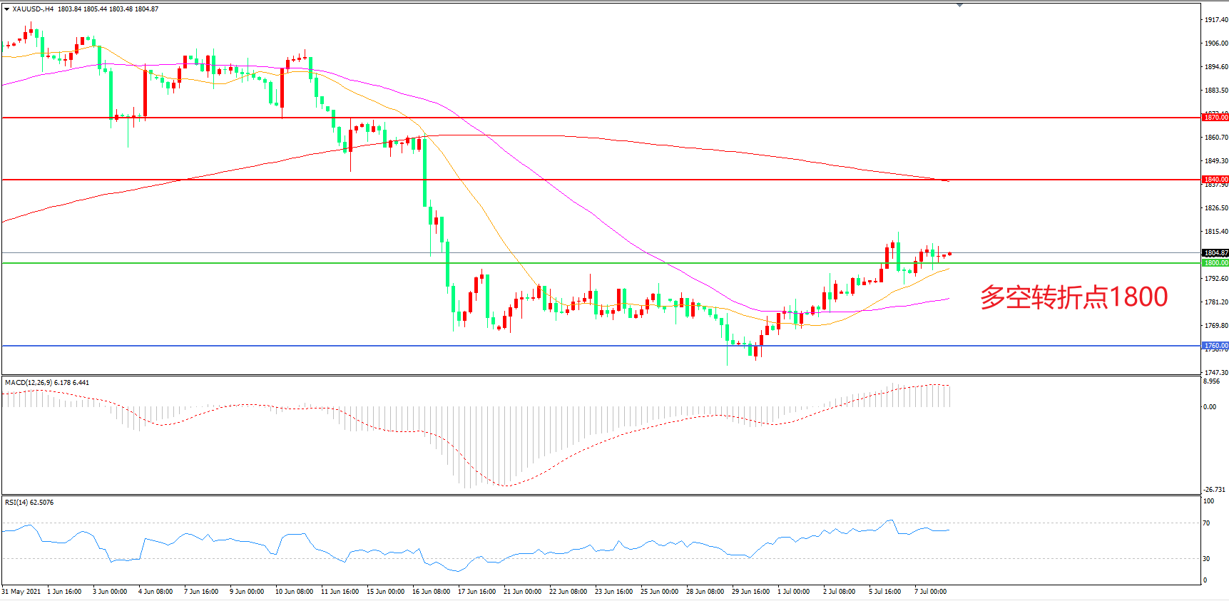 交易策略: 在1800.00之上看涨,目标1840.00 1870.00