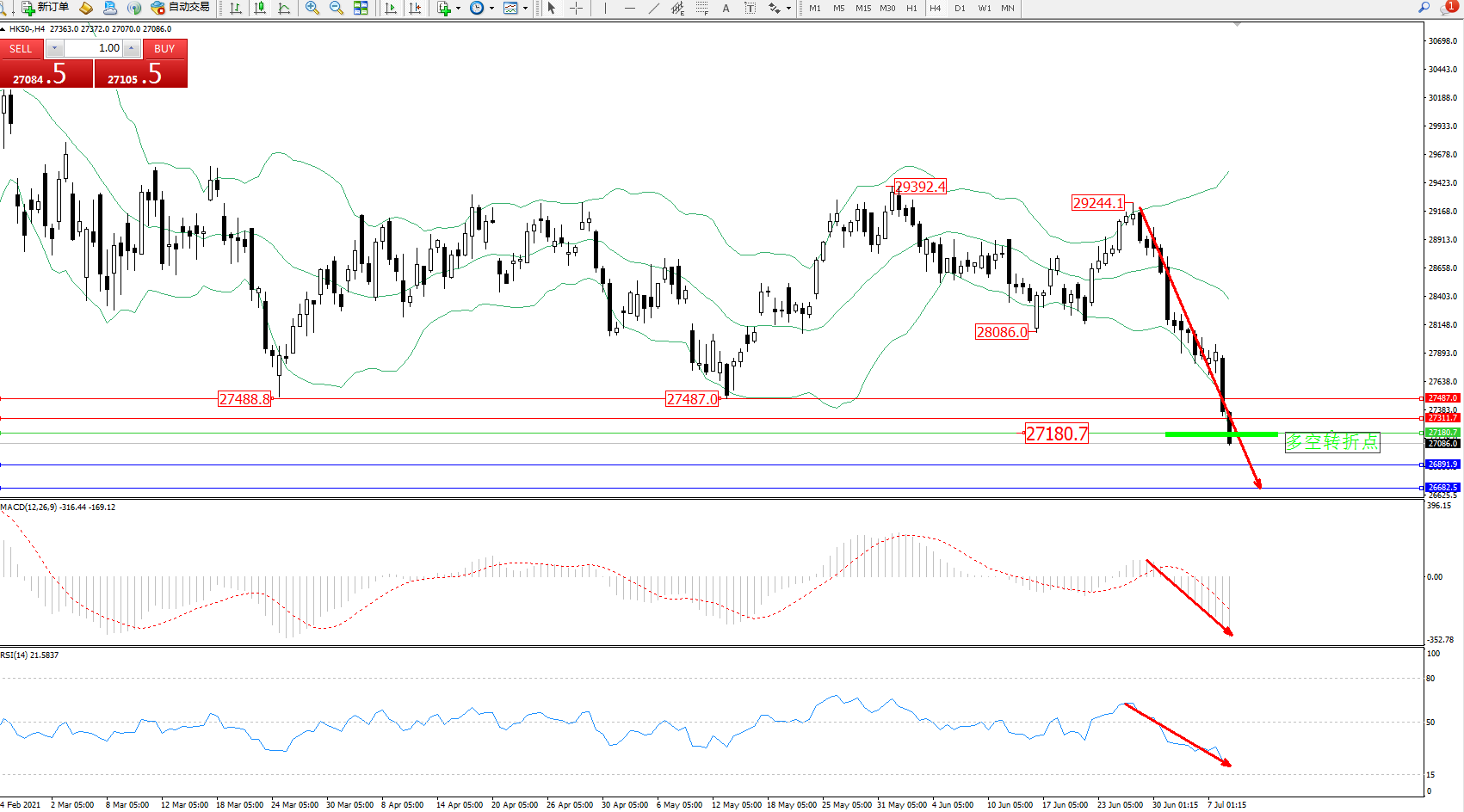 技术点评:空头动力延续布林带指标下轨附近强势下挫,跌破前期低点27487位置后不断下探,跌势未见止步,布林带指标呈张口走势态势良好,MACD指标处于空头区域持续下探中,RSI指标处于空头区域持续震荡下行;