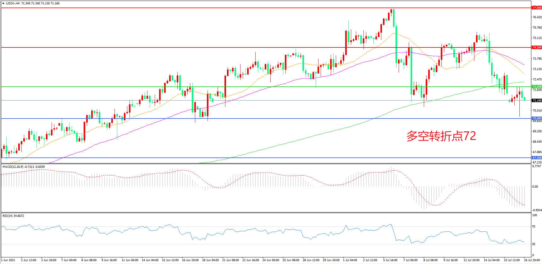 4小时图看,油价长阴下破,前期涨幅被吞噬殆尽,72美元成为短期多空分水岭,均线系统粘合形成上方阻力,MACD绿柱增加,RSI指标走平,日内震荡下行概率较大。