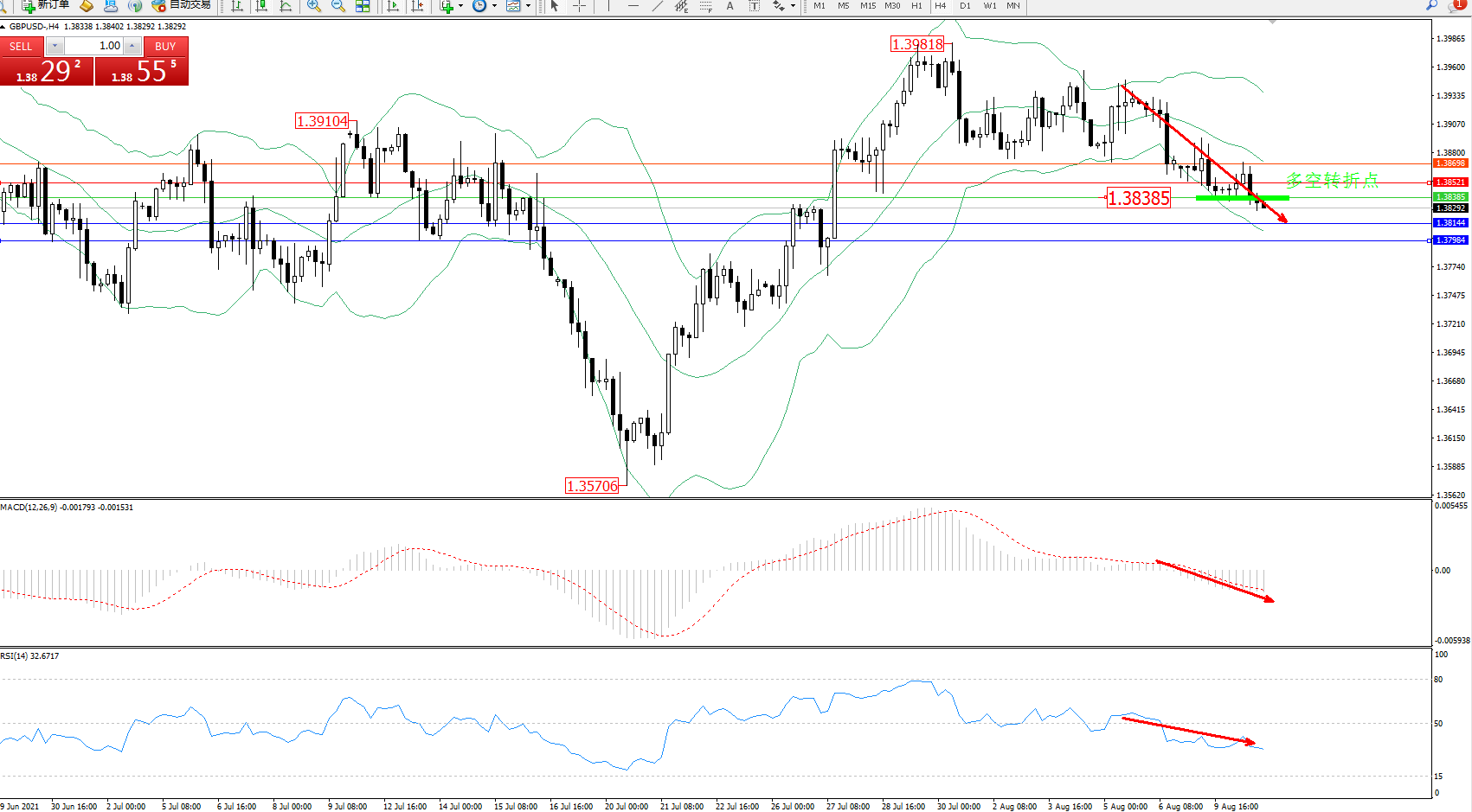 交易策略:1.38385下方看跌,目标1.38144、1.37984