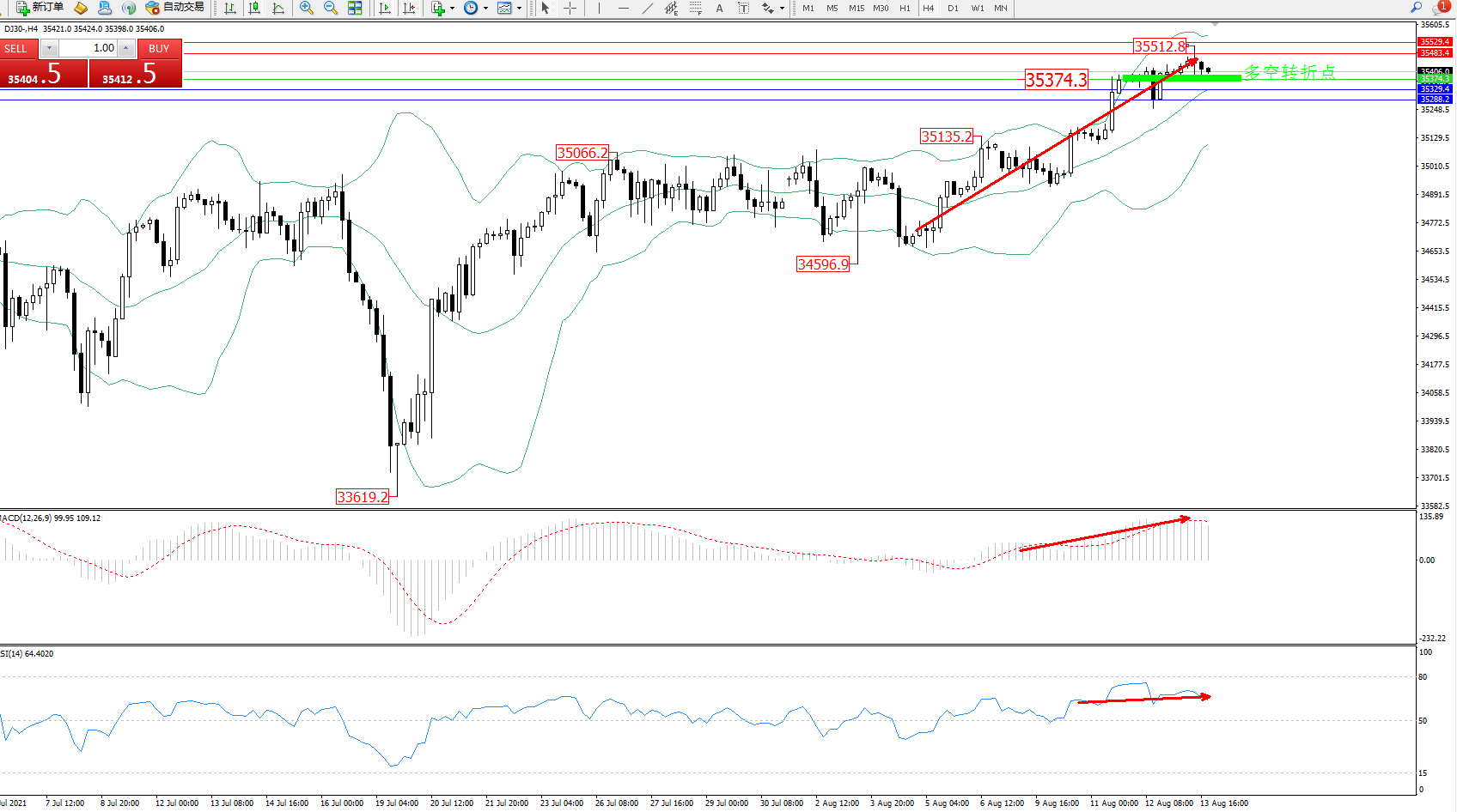 技术点评:多头动力延续布林带指标通道中上轨区间持续震荡上扬,高位抵达35512位置短暂遇阻整理,多头动力上行趋势良好,布林带指标呈收口走势中,MACD指标处于多头区域高位整理平移,RSI指标处于多头区域持续震荡中;