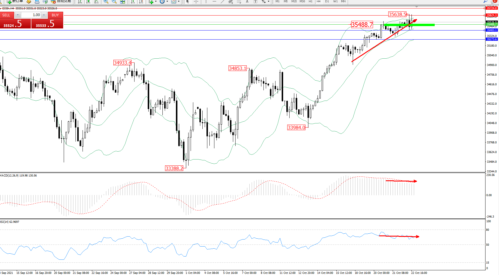 技术点评:多头动力延续布林带指标通道中上轨区间持续震荡上扬,高位抵达35638位置后遇阻短暂整理,多头动力有继续上扬态势,布林带指标呈收口走势后有继续上扬迹象,MACD指标处于多头区域维持整理平移,RSI指标处于多头区域维持窄幅整理徘徊中;