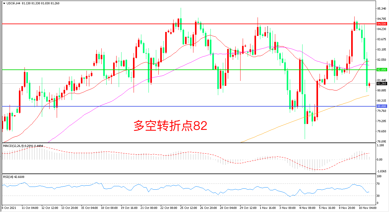 周三(11月10日),根据美国能源信息署数据显示,上周原油库存继续攀升,增加100.2万桶,虽然EIA库存数据增幅低于预期,但对于已处于高位的原油来说,近来再度增加的原油库存被市场认为偏利空,美国WTI原油破位大跌,收报81.26美元/桶。随着宏观市场的不确定性增大,原油市场看涨热情有所降温,后续油价延续低位震荡概率较大。
