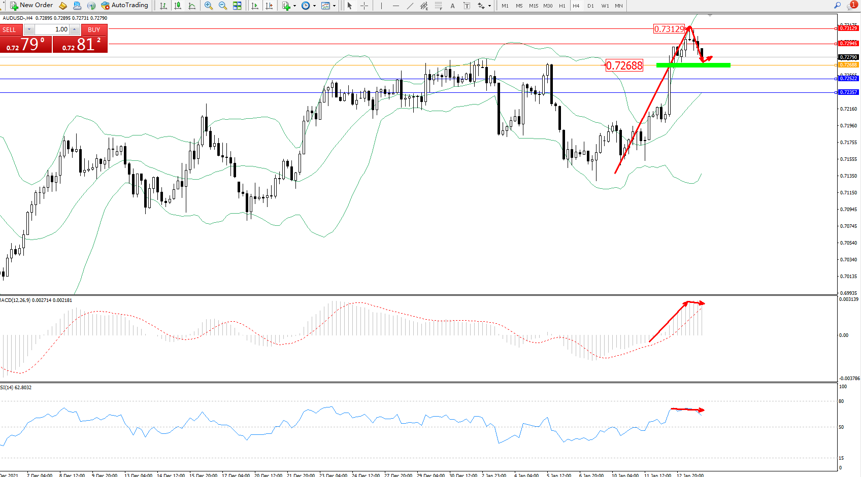 交易策略:0.72688上方看涨,目标0.72945、0.73129