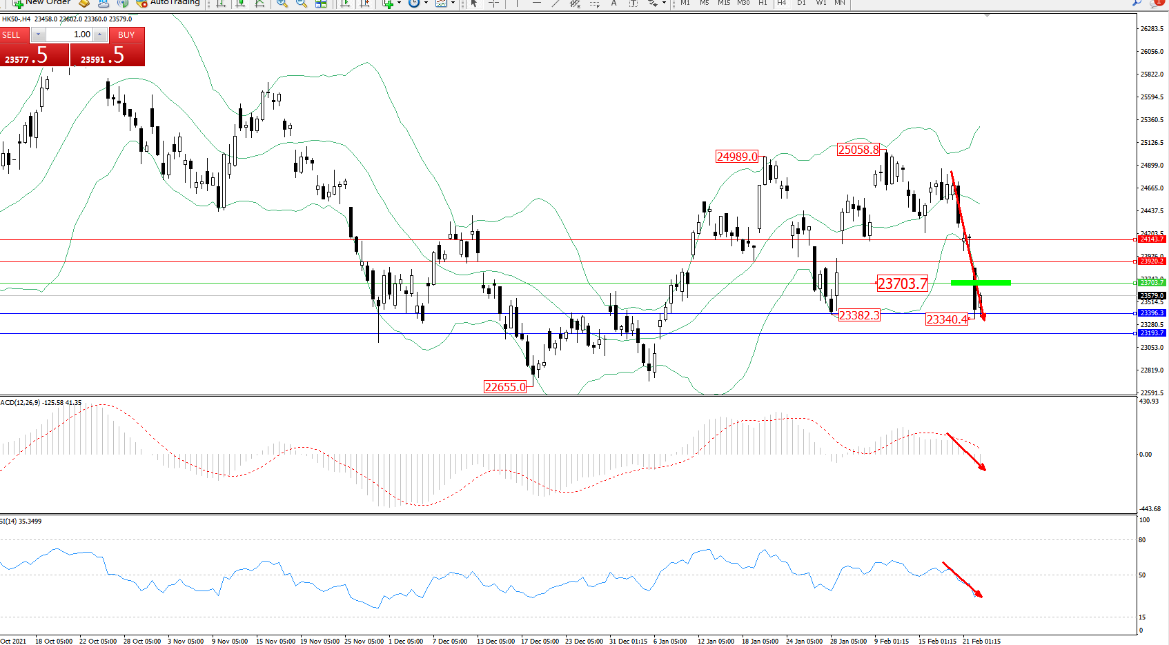 香港恒生指数2月22日(周二)收盘下跌650.07点,跌幅2.69%,报23520.0点;俄乌局势继续搅动全球市场,港股再度大跌,恒生科技指数跌1.89%盘中刷新历史低点。权重科技股、大金融股齐跌,拖累市场气氛。美团再跌超5%,3日累跌22%,京东、阿里巴巴、小米皆走低,中国平安等五大上市险企皆走低;香港银行股重挫,恒生银行绩后大跌超10%表现最差,外交部发言人汪文斌在今天举行的例行记者会上表示,今天上午王毅国务委员兼外长应约同美国国务卿布林肯通电话,就乌克兰和朝鲜半岛核问题交换意见。王毅表示,中方对乌克兰局势演变表示关注。中方在乌克兰问题上的立场是一贯的,任何国家的合理安全关切都应得到尊重,联合国宪章的宗旨和原则应当得到共同维护。乌克兰问题演变至今,与新明斯克协议迟迟未能有效执行密切相关。中方将继续按照事情本身的是非曲直,与各方接触。乌克兰局势正趋于恶化。中方再次呼吁各方保持克制,认识到落实安全不可分割原则的重要性,通过对话谈判缓和事态,化解分歧。