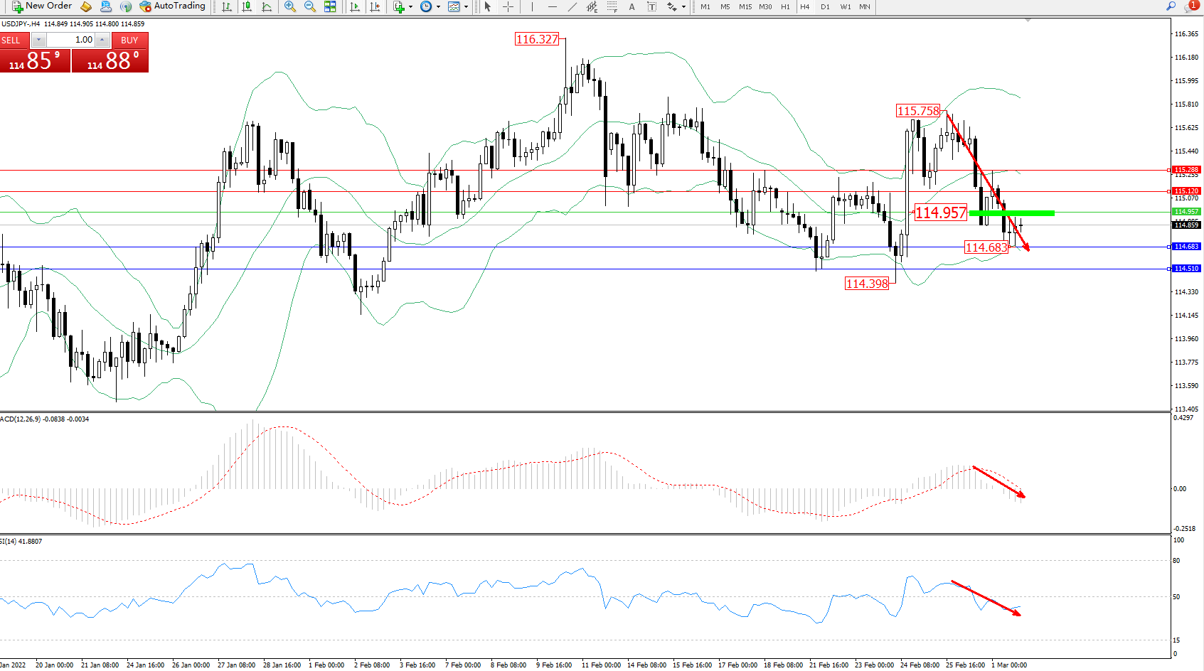 技术点评:高位空头动力急速震荡下挫,低位触及布林带指标下轨至114.683附近节点后开始整理,短期空头下行动力减弱,维持低位弱势徘徊,布林带指标呈收口走势有收口下行迹象,MACD指标处于0轴线下方空头区域维持整理下行,RSI指标处于50均衡线下侧窄幅整理平移;