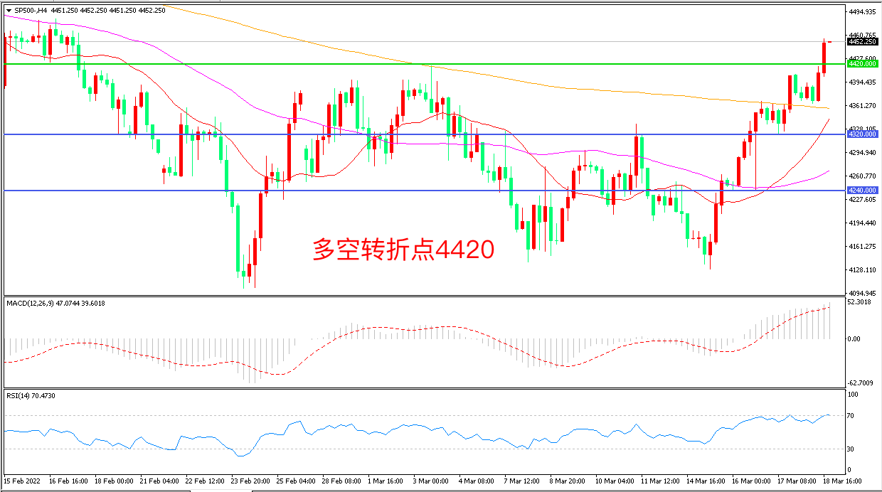 4小时图看,标普500长阳连续拉升,多头形态已经形成,MACD红柱增加,RSI指标走平,日内震荡走高概率较大。