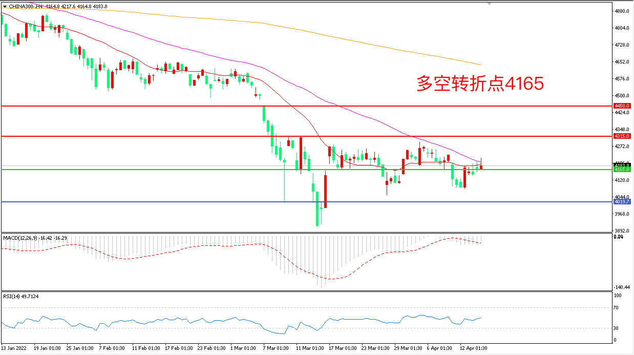 4小时图看,沪深300小幅反弹,但整体仍受制于55周期均线,4165成为多空分水岭,MACD绿柱增加,RSI指标走平,日内震荡下行概率较大。
