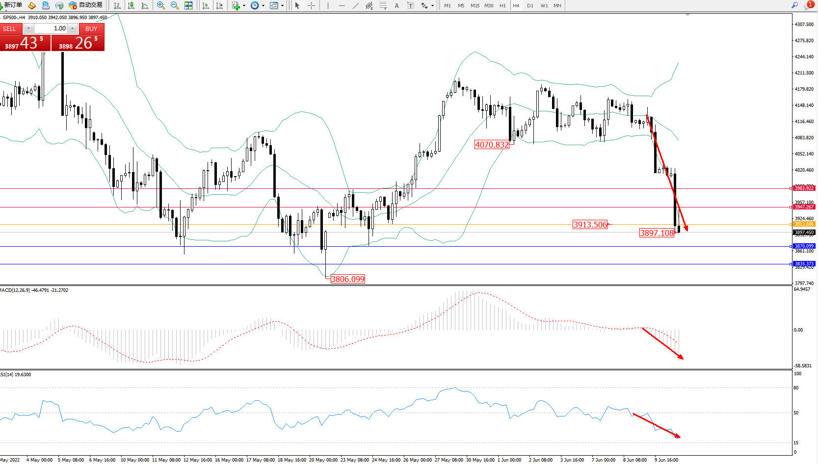 标普SP500——4小时K线图显示: