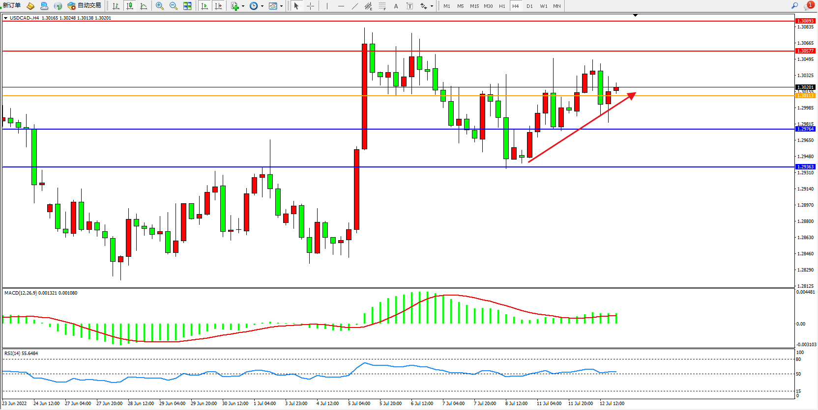 美元加元USDCAD——4小时K线图显示: