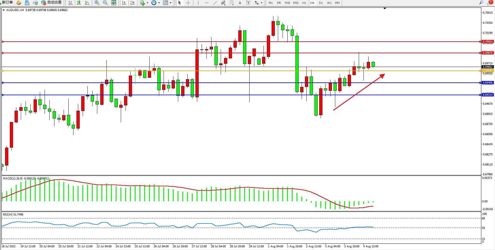 交易策略:0.69594上方看涨,目标0.69876、0.70054